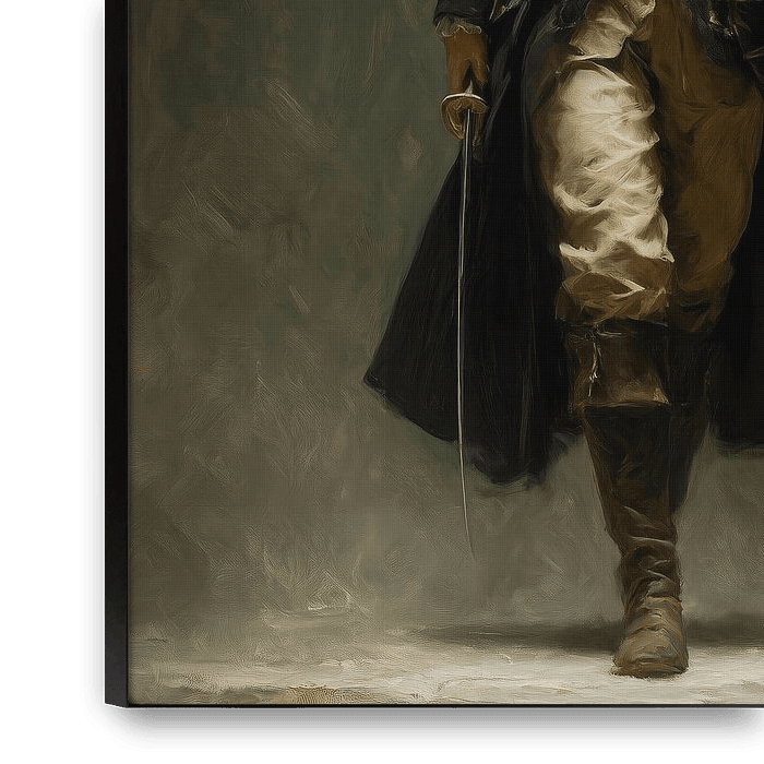 A painting of a young woman dressed in a Napoleonic-era military uniform with a determined expression, exuding authority and adventure. She is holding a sword which gives her a tough look. The overall atmosphere exudes a sense of mystery and intrigue, perfect for a character in a historical setting.