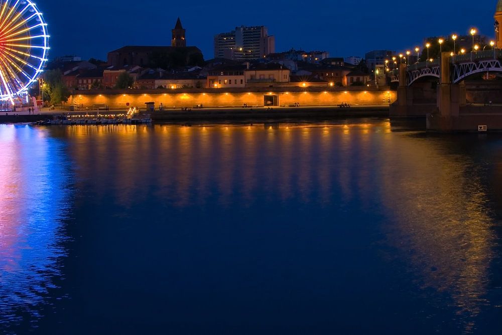 The scene radiates a peaceful tranquillity, interrupted only by the gentle lapping of the water and the occasional sound of passers-by enjoying the beauty of the night. This photograph conveys not only the romantic mood of Toulouse, but also a sense of timelessness and connection to the history of this charming city.