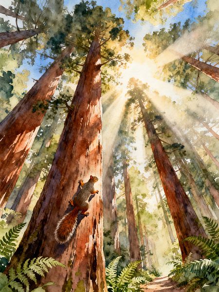 This atmospheric watercolour scene shows a frog's-eye view looking up into a majestic coniferous forest. Tall, slender tree trunks rise powerfully into the sky, while warm sunlight breaks through the canopy in bright rays. The rays of light run through the composition like a natural focal point, lending the image depth, dynamism and an…