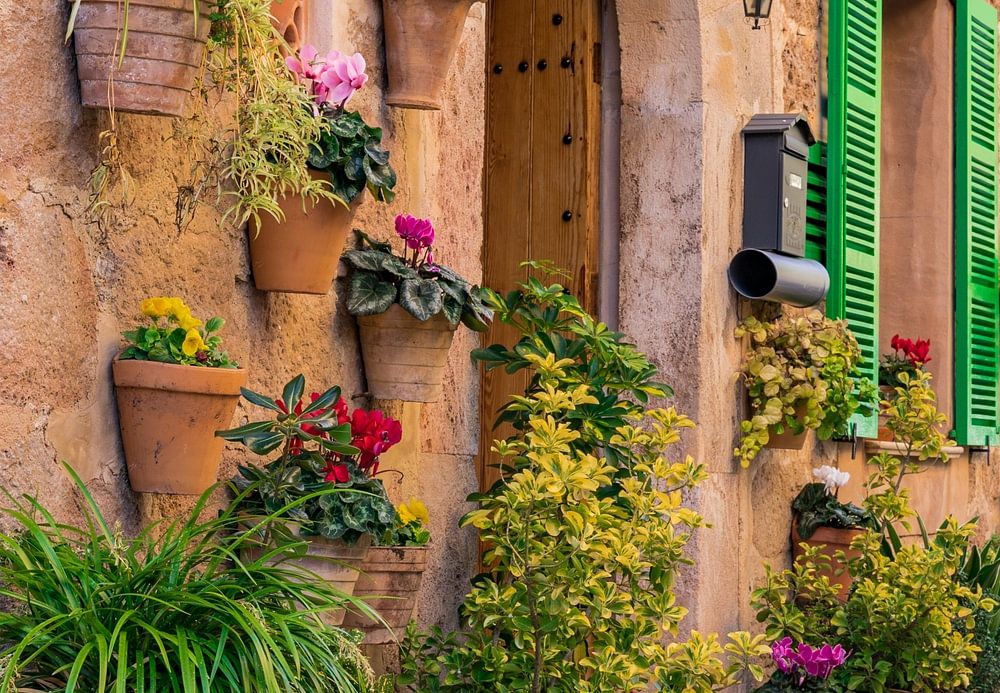 Buy this flower art Traditional house entrance in the old village of Valldemossa, Mallorca Spain Balearic islands by Alex Winter on canvas, ArtFrame, poster and wallpaper, printed on demand in high quality.