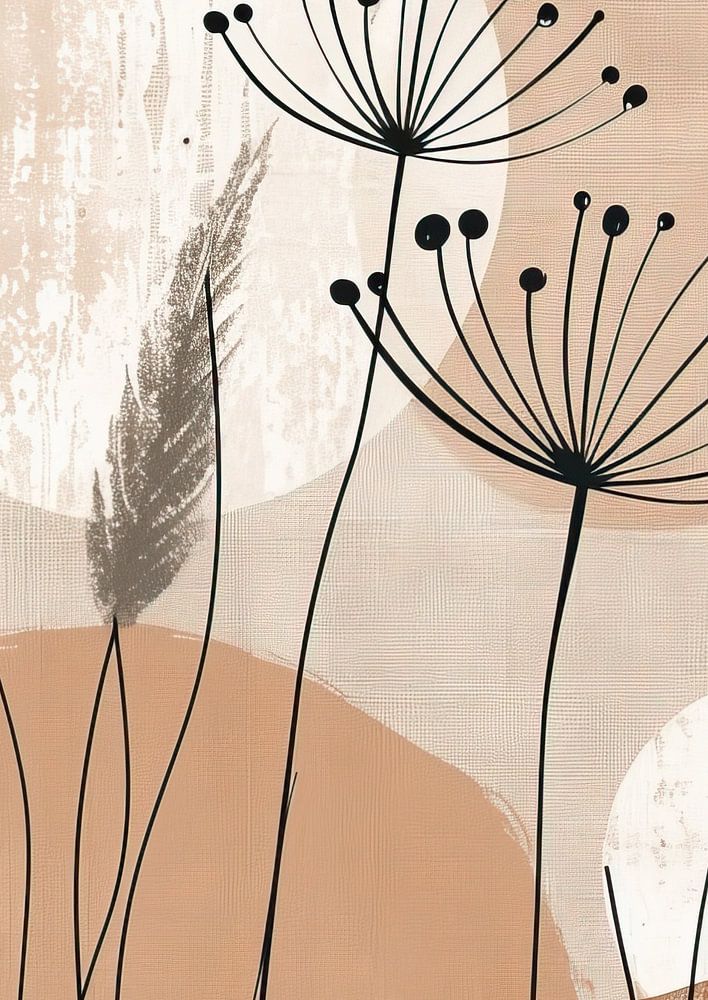 Tranquil Dawn in Abstract - This abstract painting shows a minimalist rendering of plants and flowers against a textured background. Several linear elements are visible in the foreground, representing long blades of grass and delicate dill flowers. These are rendered in deep black, contrasting sharply with the softer background. The flowers consist of graceful bulbs whose branches fan out and end in small balls, adding a playful dynamic to the work. The background is a harmonious composition of organic round shapes and subtle texture in shades of beige, cream and soft brown. The large circular elements, executed in shades of whites and pinks, overlap each other, creating a sense of depth and volume. This abstract nature scene is executed in a limited colour palette, contributing to its calm and serene look.