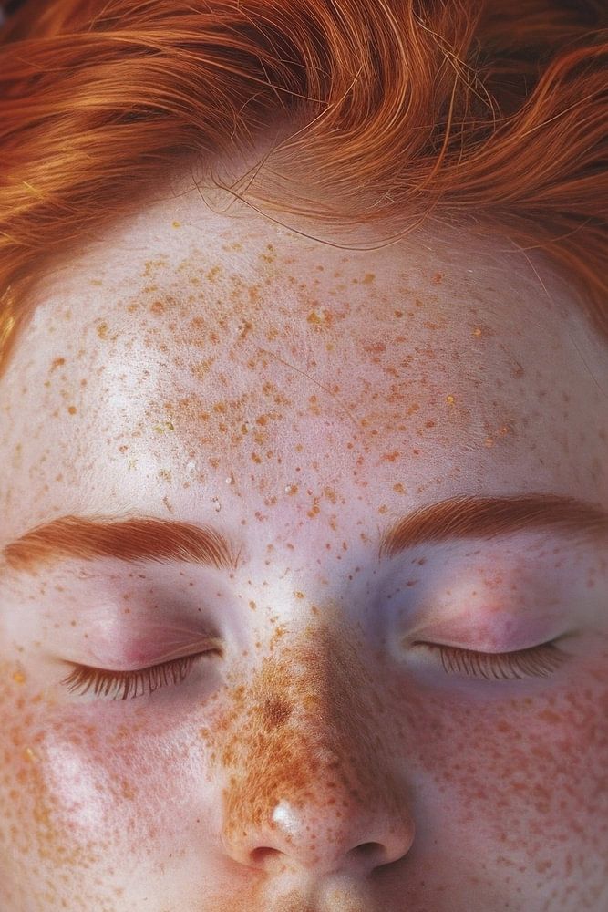 The picture captures a dreamy beauty in the middle of a delicate meadow of flowers. The bright red mane frames the face of a young woman, which is adorned with freckles. Her closed eyes radiate calm and the blossoming daisies lend the composition a fresh, natural note. A harmonious interplay of colours and textures.
