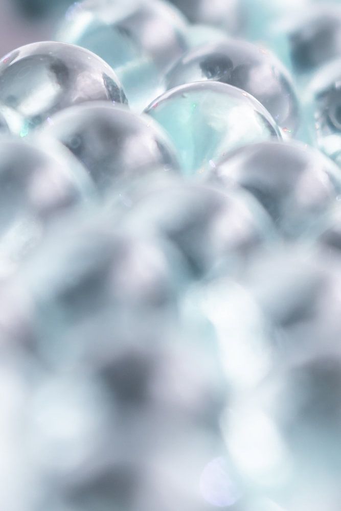 This macro shot shows a large number of clear glass spheres arranged in a loose pattern on a reflective surface. The spheres are focussed to varying degrees, creating a soft interplay of sharpness and blurriness. The light refracts in the spheres and creates subtle reflections that lend the picture a calm, almost dreamlike effect.