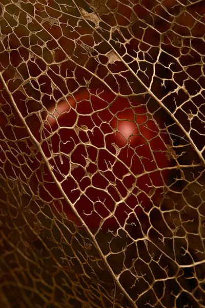 "Caught in a 'golden cage': Orange berry in a lantern (Physalis)" is a macro photo of an orange berry of the Lantern plant (Physalis). This orange berry is still inside the lantern, which is almost digested, you can almost only see the vein structure. Because a shallow depth of field was chosen and the focus is light on the vein structure, located in front of the orange berry, it looks as if the berry is trapped behind this structure. The sharpness decreases from this point, creating depth in the work. The warm "golden" light creates a warm atmosphere in the photo, which is of course enhanced by the warm natural brown - gold - orange tones.