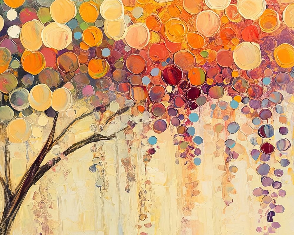 Tree Colours | Tree Full of Colour - This is an abstract painting featuring a colourful tree, whose leaves consist of numerous circles in vibrant colours that seem to float against a soft, light background.