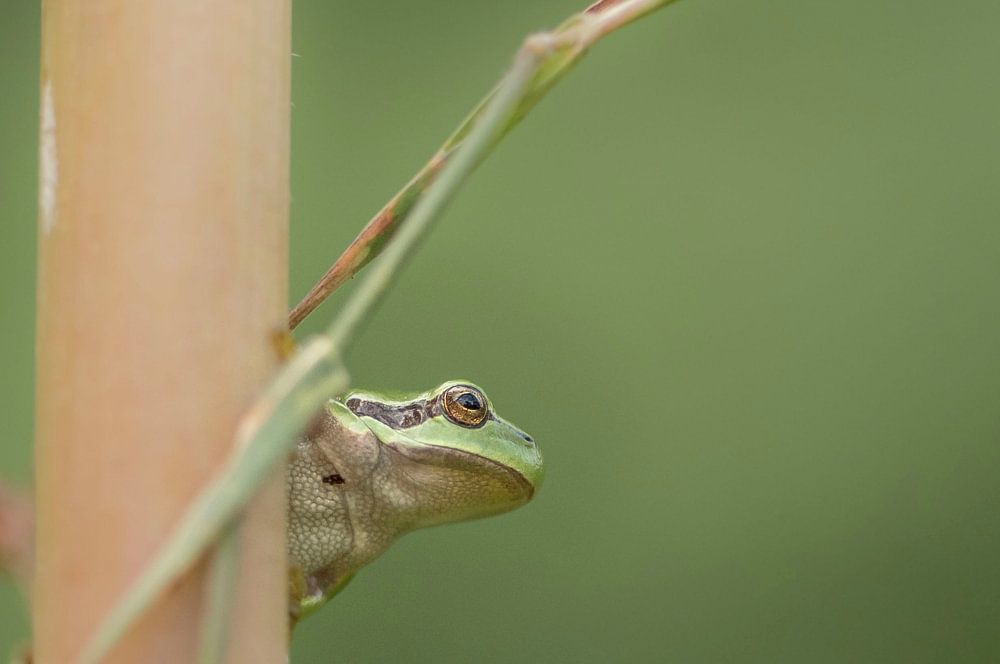 A small green tree frog emerges from behind the stem of a common hogweed. It has suction cups at the end of its fingers and toes, allowing it to climb well. It has orange eyes with a horizontal pupil. The tree frog can grow up to 5 cm tall. Its scientific name is Hyla arborea.