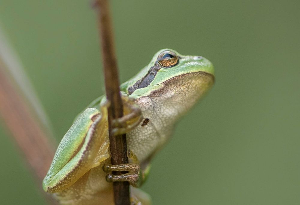 A tree frog is a small green frog with suction cups at the end of fingers and toes, allowing it to climb well. It has orange eyes with a horizontal pupil. The tree frog can grow up to 5 cm tall. Its scientific name is Hyla arborea.