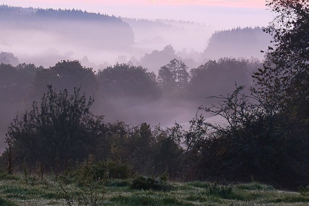 Tree in a meadow at sunrise. Cool autumn landscape. Mystical atmosphere. Landscape shot from the Saarland.