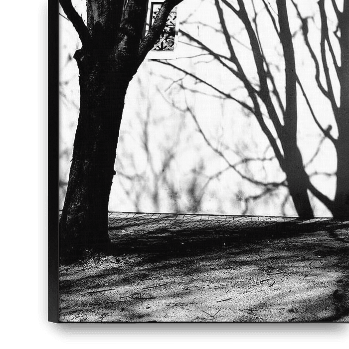 The picture shows a black and white image of two large, bare trees whose shadows are projected onto a light-coloured wall. The wall is smooth and white, with a small window in the centre that is structured by a decorative grid. The shadows of the branches and twigs create a complex pattern that extends across the entire wall surface.…
