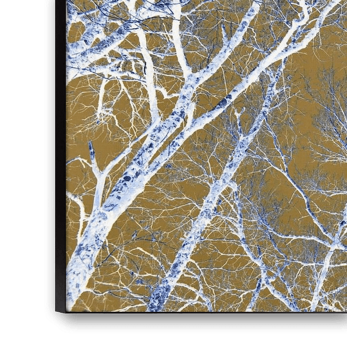 A picture of bare trees seen from below. The picture is negative, which is why the fantasy colours are created. Because of the wintery tress of the trees and the winding branches it has become a bit of a spooky landscape.