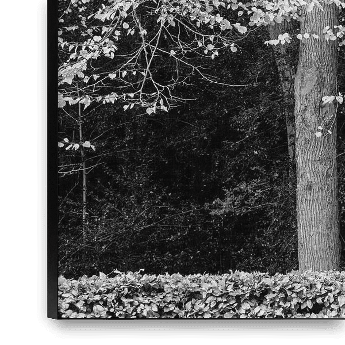 The hedge these trees are behind gives a powerful element of composition in this photo. Tight versus swaying branches together with the sunlight illuminating the leaves makes this an atmospheric, out of the ordinary photograph. Choosing black and white gives the leaves a mysterious look.
