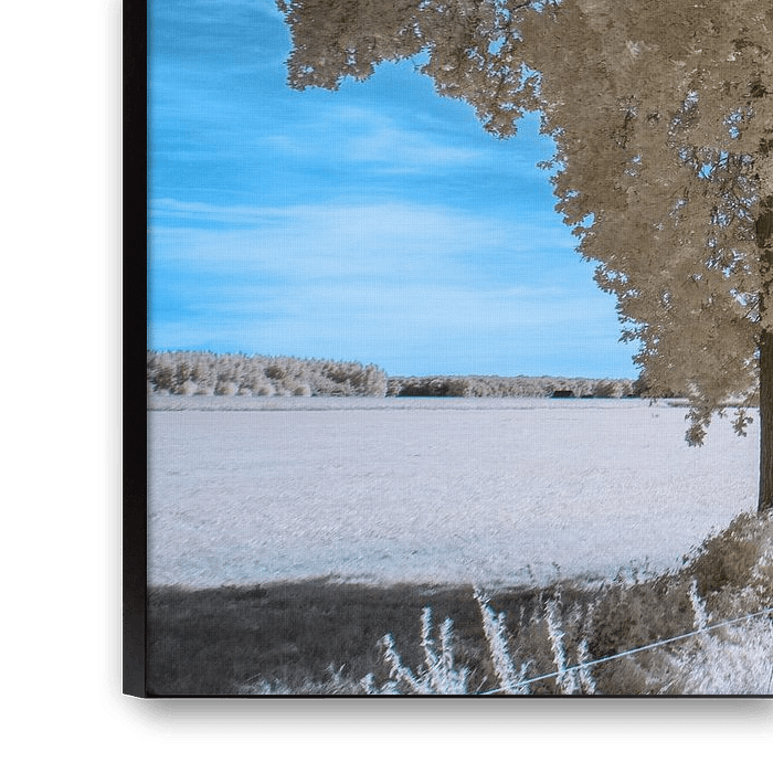 The hard shadows of the trees on the field (characteristic of Infrared light), make the image even more dynamic. This photo was taken from Koepelallee in Dalfsen not far from river Vecht (Overijselse) and Stuw Vechterweerd. Having photographed extensively at the sluice without result, I cycled on and passed this initially unremarkable spot. As I passed, I noticed this row of trees and stepped off to take a closer look. It was only on looking back at the images that I was immediately convinced of their beauty. The appeal of the image probably has to do with the division of the image according to the rule of thirds and the golden ratio.