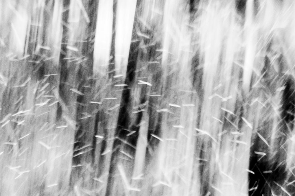 A winter photo from Belgium of a winter landscape with the trees in the landscape turning white with snow. The trees in the photo are in blur and moved, also known as ICM (Intentional Camera Movement). This technique gives the image a minimalist and dynamic feel.