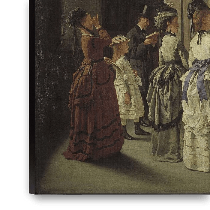 The painting depicts a group of people in front of Rembrandt's famous painting "The Night Watch" at Treppenhuis, Holland.