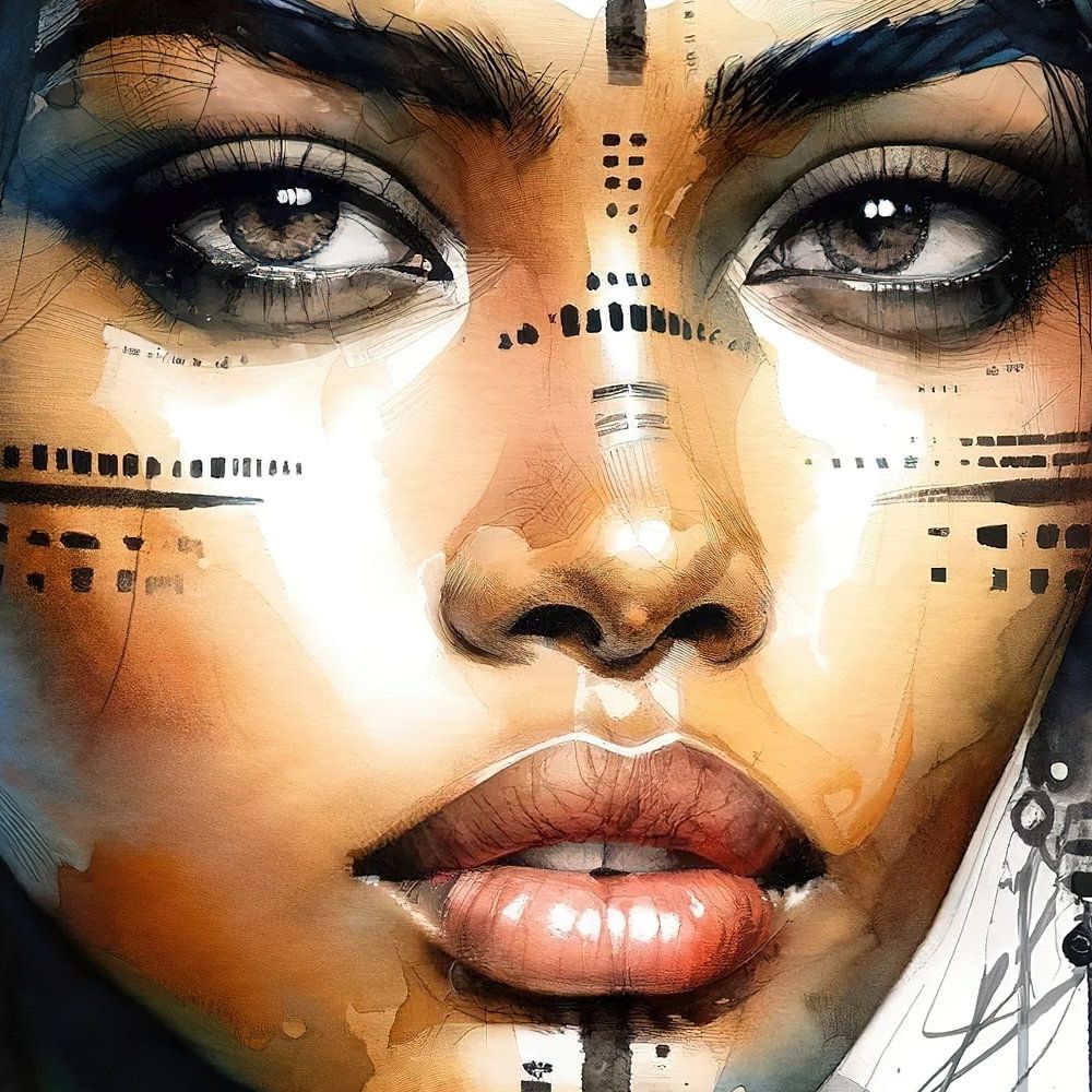 A powerful close up portrait of a tribal muse with a calm direct gaze, framed by a veil like hood and bold geometric markings across the face. Luminous watercolor washes build warm skin tones and deep shadows, while crisp accents define lashes, brows, and lip highlights for clear wall readability. The open light background preserves…