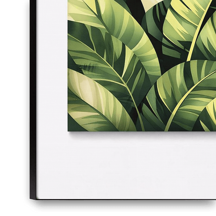 This artwork features a lush composition of tropical botanical leaves, layered in rich shades of green with a soft, textured finish. Inspired by jungle foliage and modern botanical illustration, the design combines monstera and palm-like leaves arranged in a harmonious, overlapping pattern. The natural color palette evokes calmness,…
