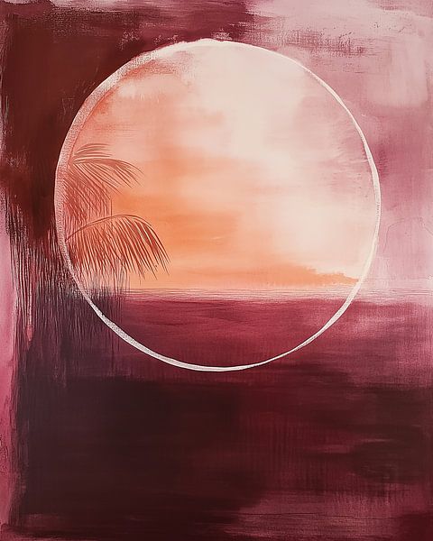 This artwork exudes a tranquil, almost dreamlike atmosphere in which reality and imagination merge. At its centre is a soft, rounded shape reminiscent of a setting sun, captured within a perfect circle of light. This circle acts as a window to another world—a tropical paradise that is not literally depicted, but rather suggested through…