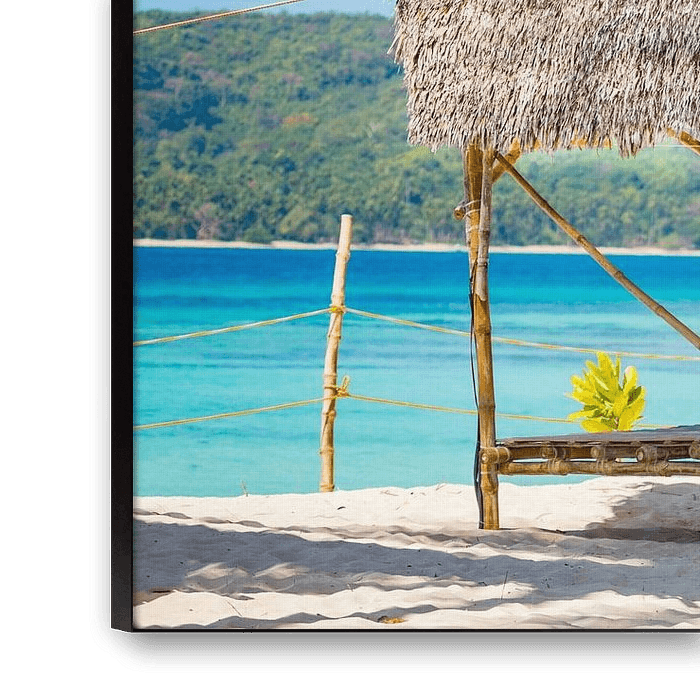 This picture shows an idyllic hut on stilts, located on a tropical beach in the Philippines. With a thatched roof and a bright yellow curtain gently blowing in the breeze, this hut offers an authentic and relaxing accommodation experience. The turquoise sea and surrounding green hills provide the perfect backdrop for this unique accommodation, ideal for adventure travellers and nature lovers. The combination of white sandy beaches, azure waters and rustic cabins evokes a sense of serenity and escape. Perfect for wall decoration that adds a touch of tropical serenity and adventure to any interior."