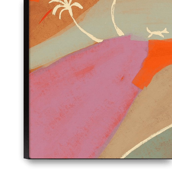 A colourful painting with areas in warm tones: orange, lilac, bright pink, soft green and deep red. In the foreground, a simple line drawing of mountains, two palm trees and a small dog. The little dog seems to be heading for the tip of a rock, as if to look out over the landscape for a moment. The combination of vibrant colours and…