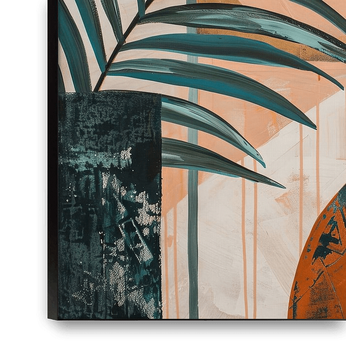 This modern painting combines geometric shapes with vibrant, tropical leaves to create a fascinating composition. The lush green tones of the leaves contrast harmoniously with the warm earthy colours and cool pastel tones in the background. The clear lines and balanced colour palette give the work a contemporary, calming aura. Inspired…