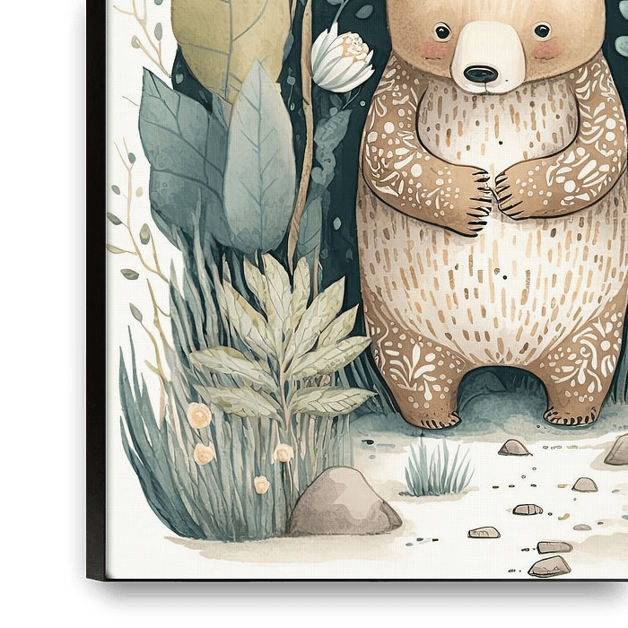 An illustration with bear surrounded by leaves. In pastel shades. Choose the size and material of this unique print yourself. Fast delivery and high quality.