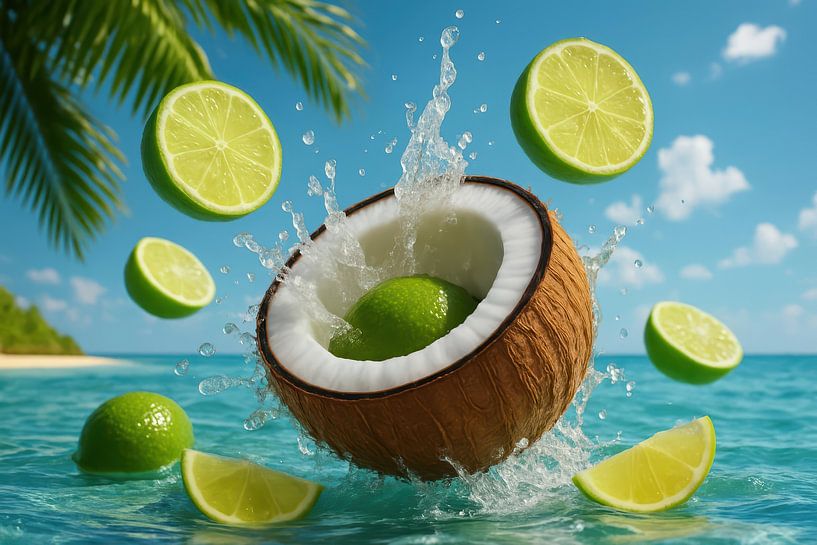 An open coconut catches a shiny lime while water droplets splash in all directions. Lime wedges float in the air, above a clear turquoise sea and under a bright sky. The rough fibre pattern of the coconut shell contrasts sharply with the shiny, fresh lime green and soft white of the flesh. In the background, faint palm leaves suggest a…