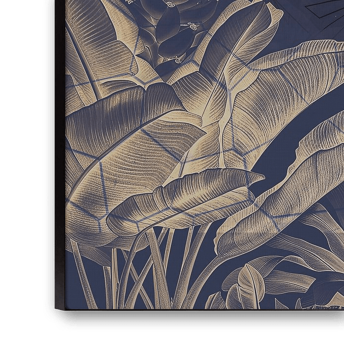 This elegant wall art brings together tropical nature with a mysterious nighttime theme. The subtle, detailed illustration of banana leaves and flowers is highlighted by a deep night blue background, giving it a dreamy and serene feel. The geometric line pattern on the background adds a modern and contemporary element to the artwork. The soft beige tones of the leaves create a beautiful contrast to the dark background, making this artwork a striking piece for any room.