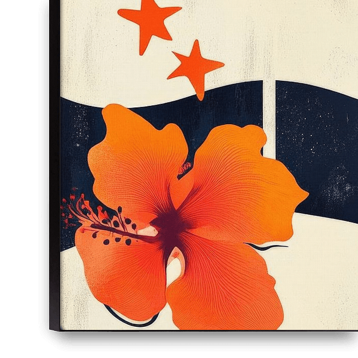 Vibrant orange hibiscus flowers radiate freshness and harmonise perfectly with wavy, sweeping lines in deep black. The playful stars add a touch of fantasy to the overall work. This fascinating work of art transforms any living room into an oasis of creativity and joie de vivre, ideal for relaxed evenings and social gatherings.