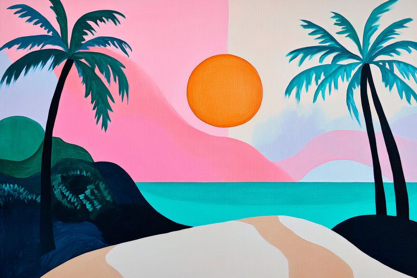 Vibrant colours blend harmoniously to create a breathtaking coastal panorama, where the sun rises in majestic orange over the gentle, glistening water. The friendly palm trees frame this tropical idyll and invite you to dream. Ideal for the living room, it lends your room a relaxed, summery atmosphere.