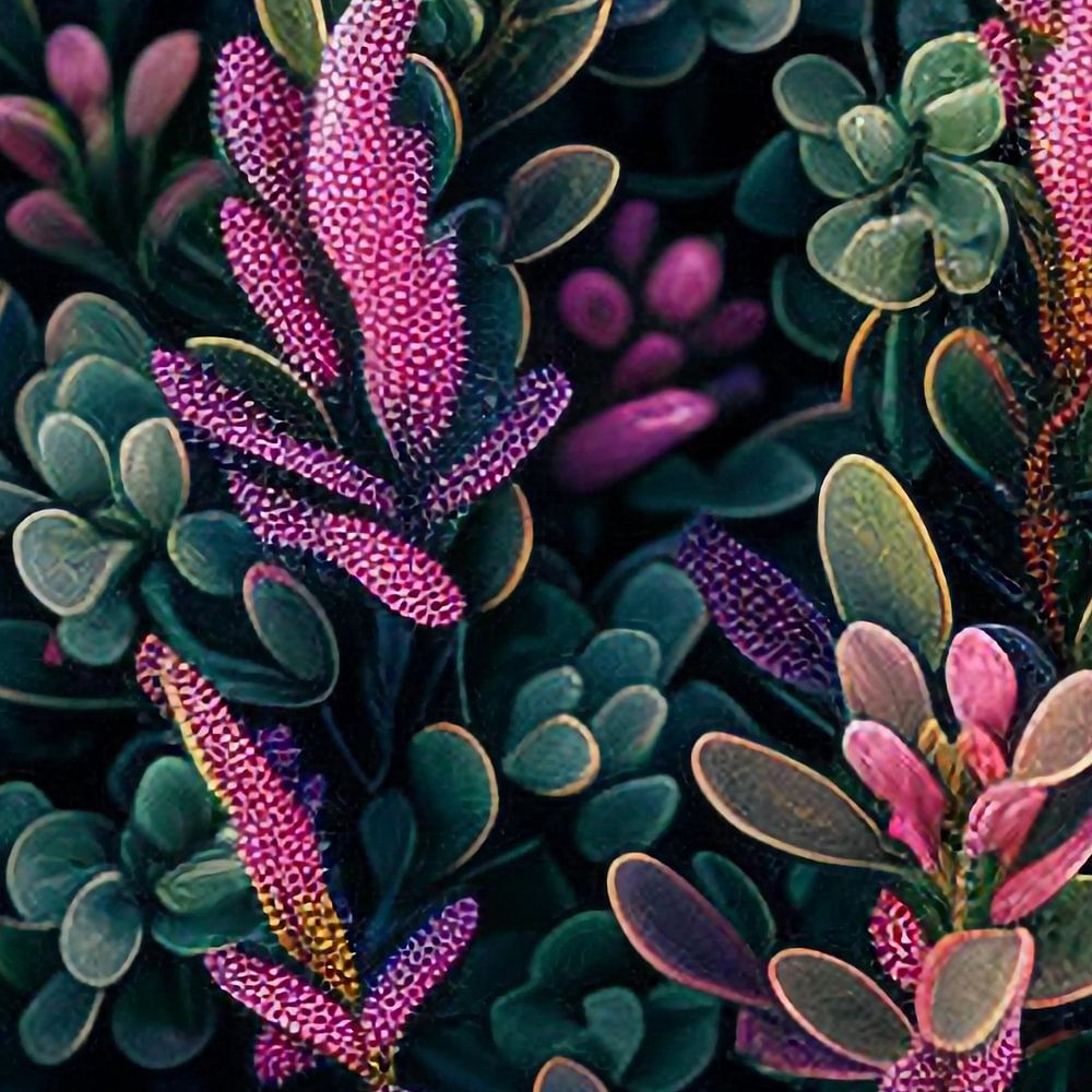 A lush and vibrant botanical composition with an array of colourful leaves and plants in bold shades of pink, purple and green. The intricate details and layered patterns create a sense of depth and vibrancy, making this piece an eye-catching celebration of the diversity and colours of nature. Ideal for adding warmth and energy to any room.