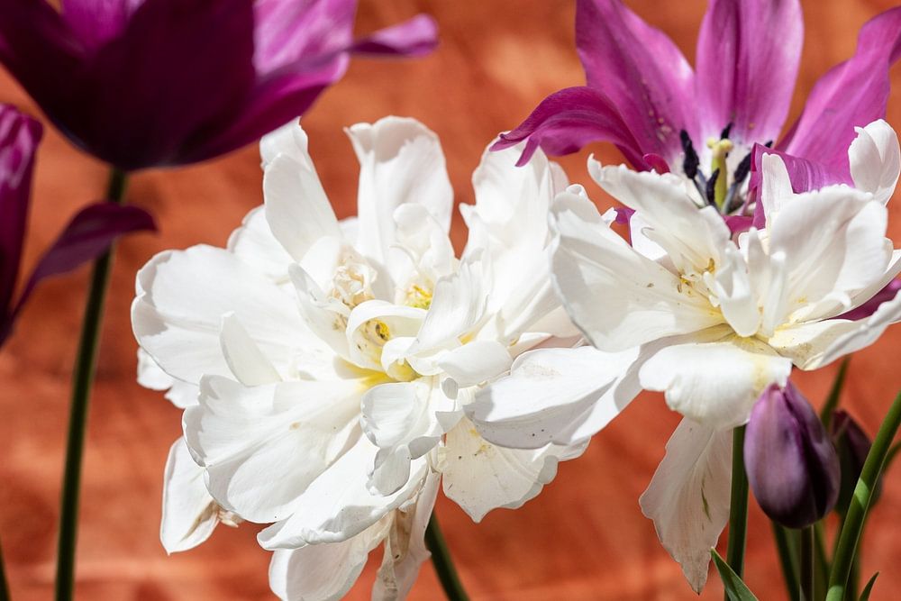A vibrant and expressive floral photograph in which white and purple tulips shine against a warm, ochre-coloured background. The combination of bright floral tones with the rich, almost abstract orange-red in the background gives this work a warm and powerful feel. Ideal as an eye-catcher in a modern or boho interior. This picture brings together a touch of nature and artistic flair in one image.