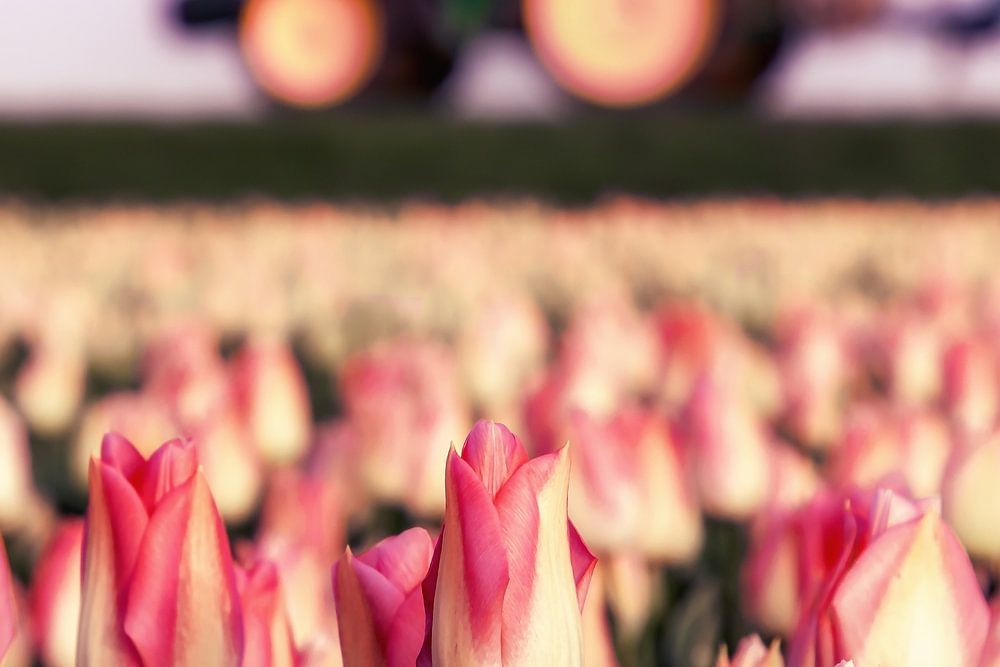 Yellow/pink tulip field in the Flevopolder with a tractor in the background