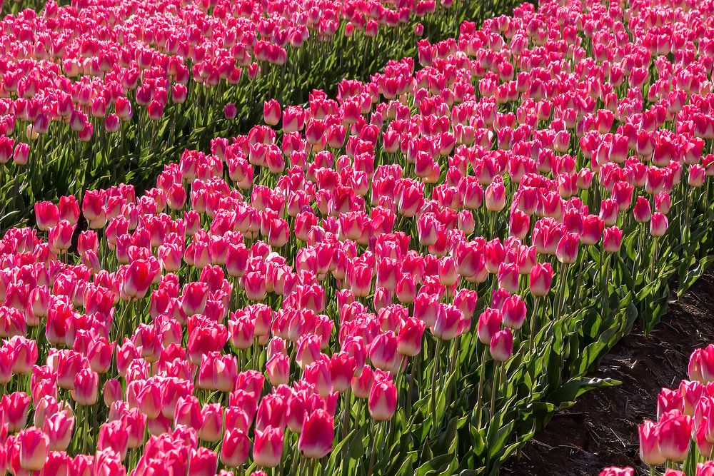Field of pink tulips. Spring shot. Slanting diagonal lines.