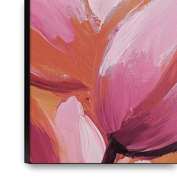 The painting evokes an intense and sensual image. When tulips are cloaked in powder pink, they appear not only as flowers, but as leaves that softly glow in the daylight. The petals look like brushstrokes of silk: smooth, slightly shiny and subtly translucent at the edges. In the heart of the flower, the carmine deepens to an almost…