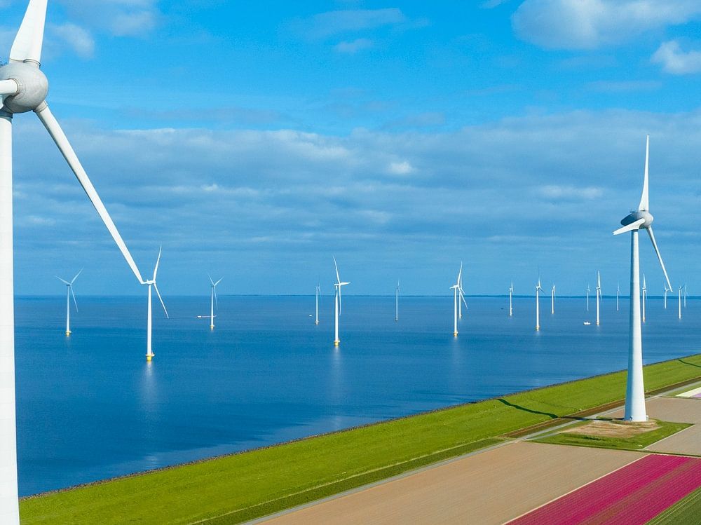 Tulips growing in agricultural fields with rows of wind turbines on the IJsselmeer shore in the background in the Noordoostpolder in Flevoland, The Netherlands, during springtime seen from above. The Noordoostpolder is a polder in the former Zuiderzee designed initially to create more land for farming.