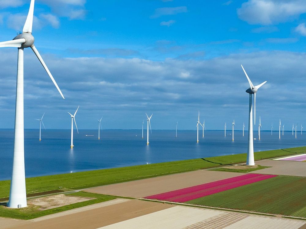 Tulips growing in agricultural fields with rows of wind turbines on the IJsselmeer shore in the background in the Noordoostpolder in Flevoland, The Netherlands, during springtime seen from above. The Noordoostpolder is a polder in the former Zuiderzee designed initially to create more land for farming.