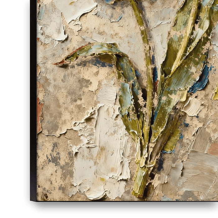 Two tulips in all their eccentric splendour: one glows in a vibrant dark red and orange, the other shimmers in a dreamy cream-lilac with visible leaf veins. The tulips’ characteristic features are rendered with remarkable attention to detail and rich texture. The weathered background, with its multi-layered flaking of colour in beige,…
