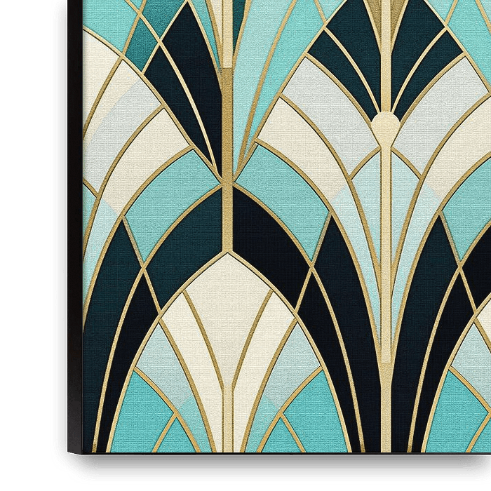 Buy this art deco artwork Turquoise and Gold Symmetrical Art Deco Motif by Whale & Sons on canvas, ArtFrame, poster and wallpaper, printed on demand in high quality.