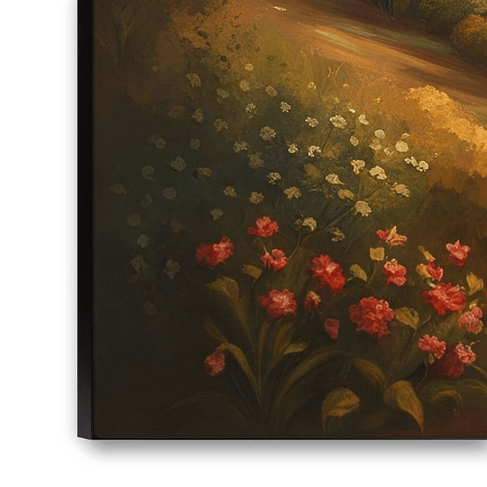 The oil painting shows a picturesque Tuscan landscape with charming houses built of warm, terracotta-coloured stone. A winding path meanders through the scenery, lined with tall, elegant cypress trees and colourful flowers. The houses have red tiled roofs that glow in the sunlight. Gentle hills stretch out in the background. The sky is painted in soft orange tones, interspersed with delicate clouds. The detailed brushwork and harmonious colour palette convey the tranquillity and beauty of the Tuscan landscape and its traditional architecture.