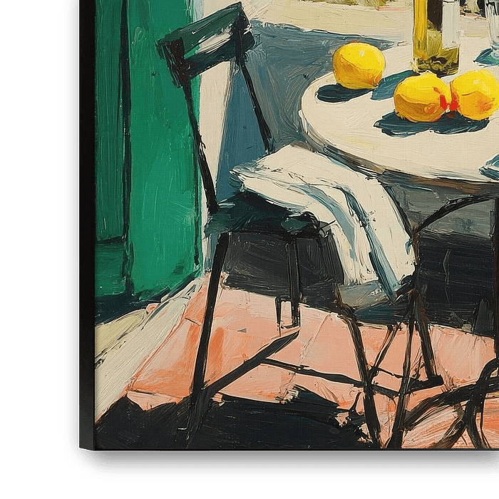 This still life in the style of James Lichtenstein shows a round white table outside, set with two lemons, olive oil and glasses, with a view of the green spring landscape of Tuscany. A black metal chair stands next to the table, with a light blue and green door leaning against the wall in the background. A glass of clear water or wine and a small lemon on a bottle complete the scene. The picture captures the tranquillity and lightness of rural life, combining clear forms, soft colours and harmonious lighting moods that emphasise the Mediterranean charm and natural beauty of the surroundings.