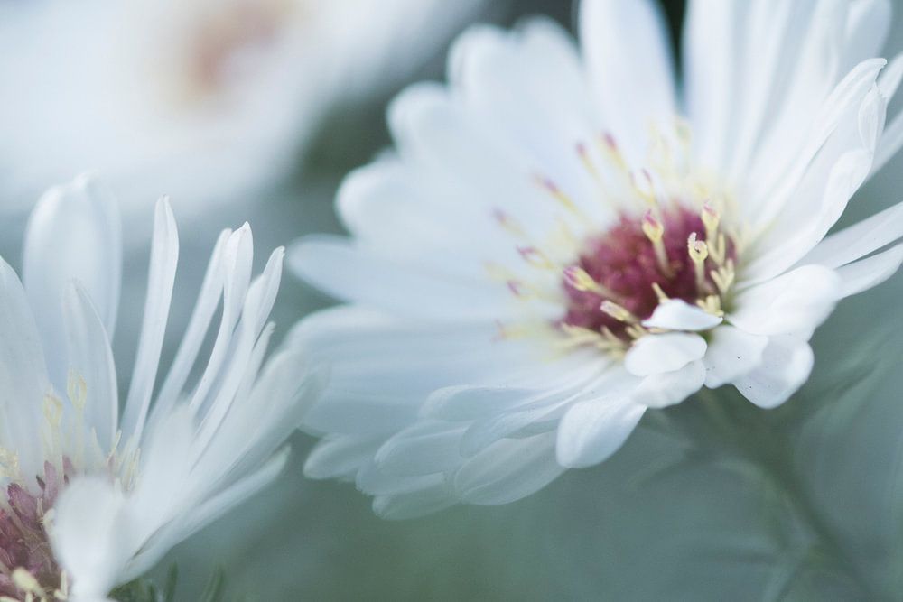 Close up van twee chrysantjes in een bloemenveld met beperkte scherptediepte.