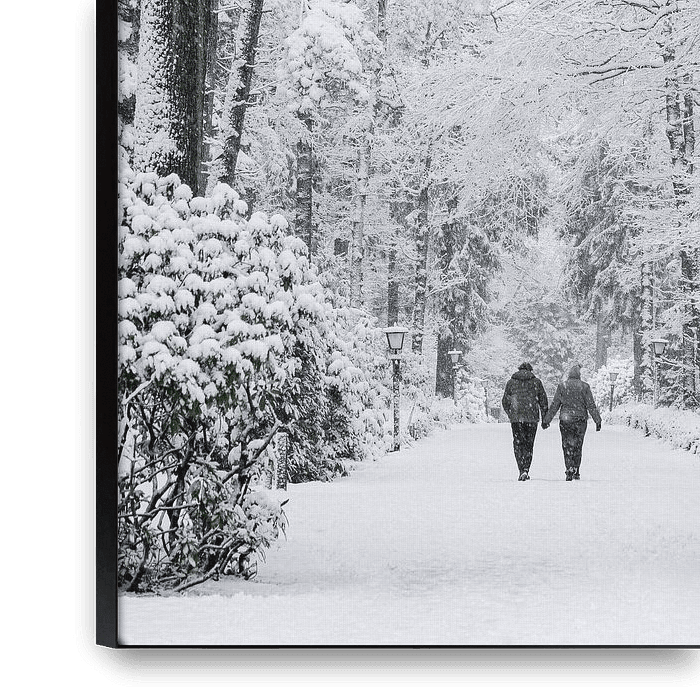 Two people, one path, now softened by snow, where footsteps fade and time seems to slow. Hands intertwined, breath visible in the cold. A fleeting world, yet theirs to hold.