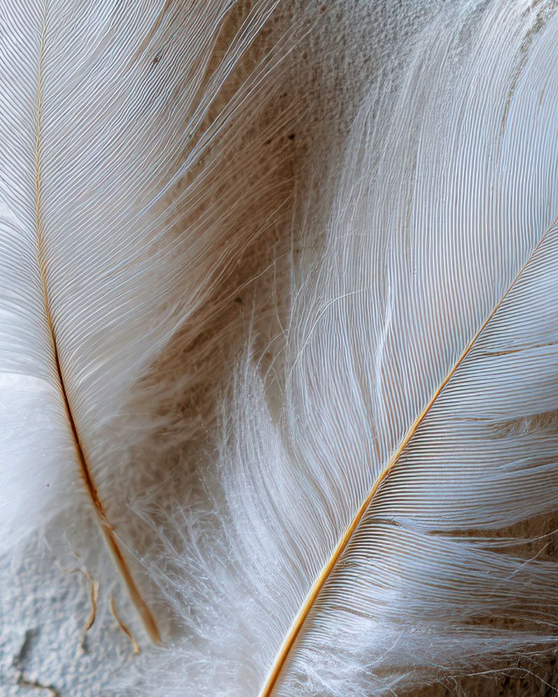 This picture shows two white feathers lying on a weathered concrete surface. The wall is rough, cracked and shows traces of ageing. The feathers lie at an angle to each other and subtly catch the incident light. The positioning creates a visual balance between soft and hard.