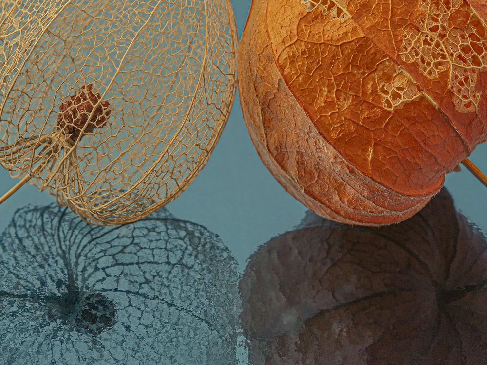 The lantern on the left is already at a much further stage. The orange "skin" has already disappeared here and only a fragile structure remains. Through this vein structure, you can see the little berry of the lantern, even though it is also decaying, you can still see its orange colour.