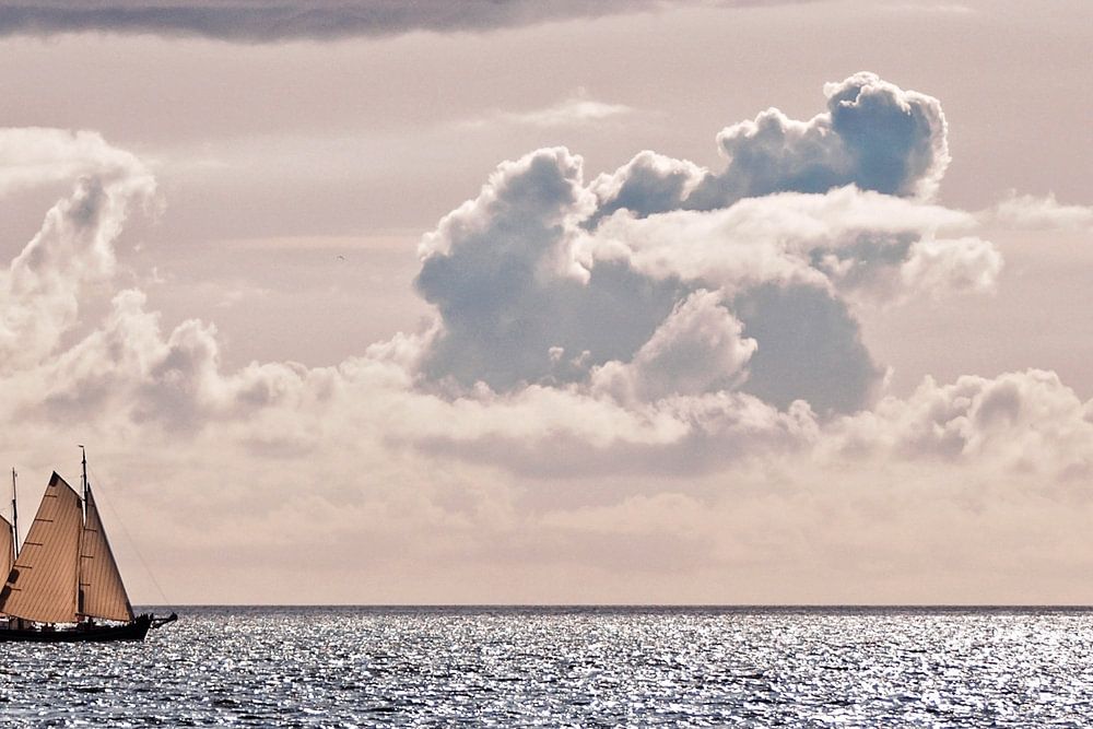 On the North Sea, a two-master lies quietly on the water. The horizon is clear and sharp, a straight line where sea and sky meet. Above the boat, two layers of clouds draw in; the lower are beautiful, soft grey and subtly lit by the sun, while the upper layer looks darker and stormy, heavy and threatening, as if the sky could break open…