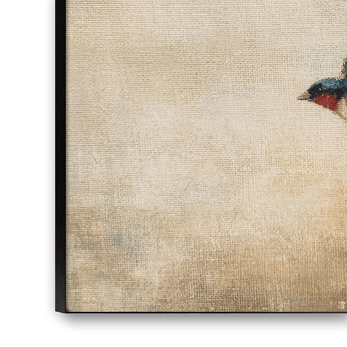 This delicate painting shows two swallows gliding gracefully through the air. Their blue-black wings and warm red breast form a beautiful contrast to the soft, beige background. The brushstrokes are subtle but expressive, making the birds' movement palpable. The texture of the canvas adds an authentic, artisanal feel. The work exudes tranquillity, freedom and natural beauty. The slight blurring of the background creates the impression of height and light, as if the birds are floating in an infinite sky. Despite its simplicity, the composition is full of dynamism and emotion. This artwork captures the fleeting moment of freedom that birds symbolise. The warm colours and soft tones bring a sense of peace and nostalgia. A timeless ode to nature, sky and movement.
