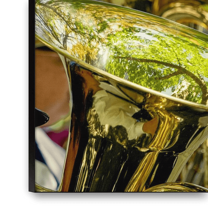 Close-up of two tuba's with the reflection of green leaves during an outdoor performance.