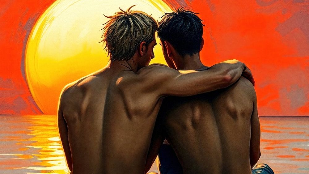 The wide-format painting captures a quiet, almost timeless moment by the sea. Two young men sit close together on the beach, their postures characterised by intimacy and affection. The man on the right puts his arm gently and protectively around the other's shoulders and turns his gaze lovingly towards him, while the man on the left, lost in thought, looks towards the horizon.
