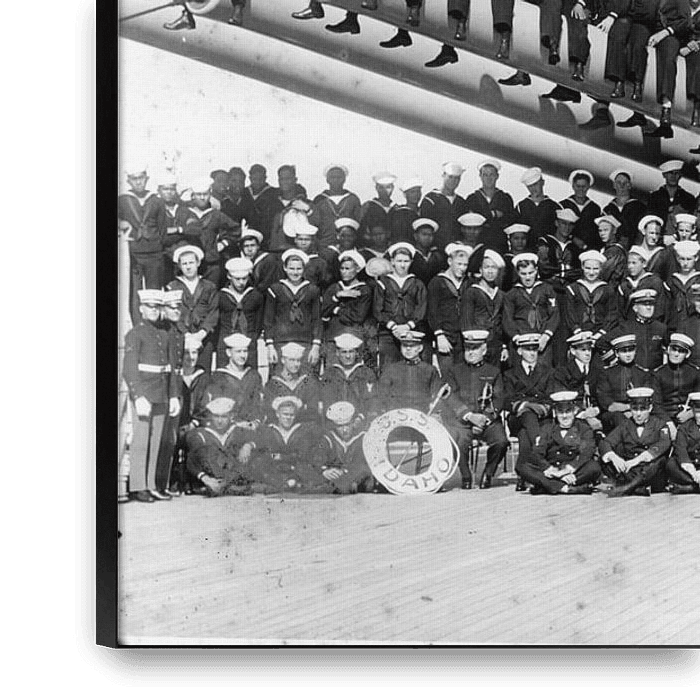 All marines stand or sit on the naval ship or the guns. The seabed was put into use shortly after the First World War. The warship is depicted in black and white.