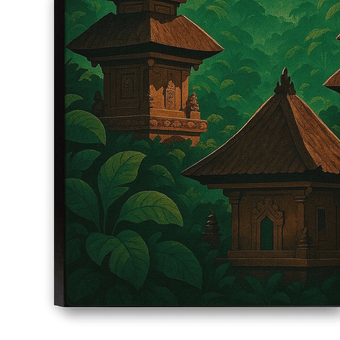 Immerse yourself in the spiritual heart of the "Island of the Gods" with this lush vintage poster of Ubud, Bali. The artwork transports you to a hidden sanctuary deep within the rainforest, where traditional Balinese Meru towers (multi-tiered shrines) rise elegantly above the canopy. The scene is bathed in a mystical green glow, with…